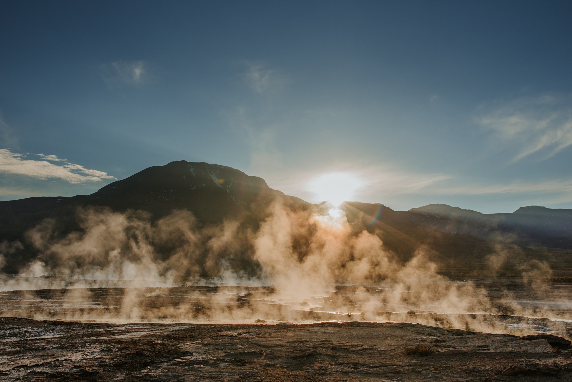 W dolinie otoczonej Andami znajdują się dziesiątki mniejszych lub większych gejzerów, zwanych El Tatio co w języku Quechua oznacza „Old man crying”. Woda w gejzerach osiąga wysoka temperaturę produkując eksplozje pary sięgającą nawet do 10 m. Uwierzcie mi na słowo, taki widok obudzi nawet zaspaną trzynastolatkę, a jeśli widok nie da rady to panujące wokół minus 10 już na pewno.